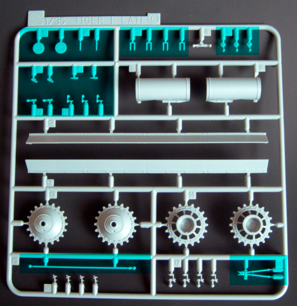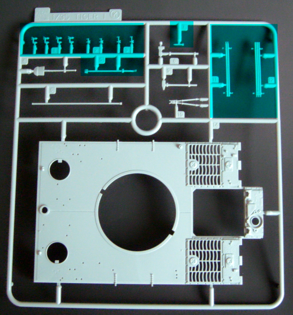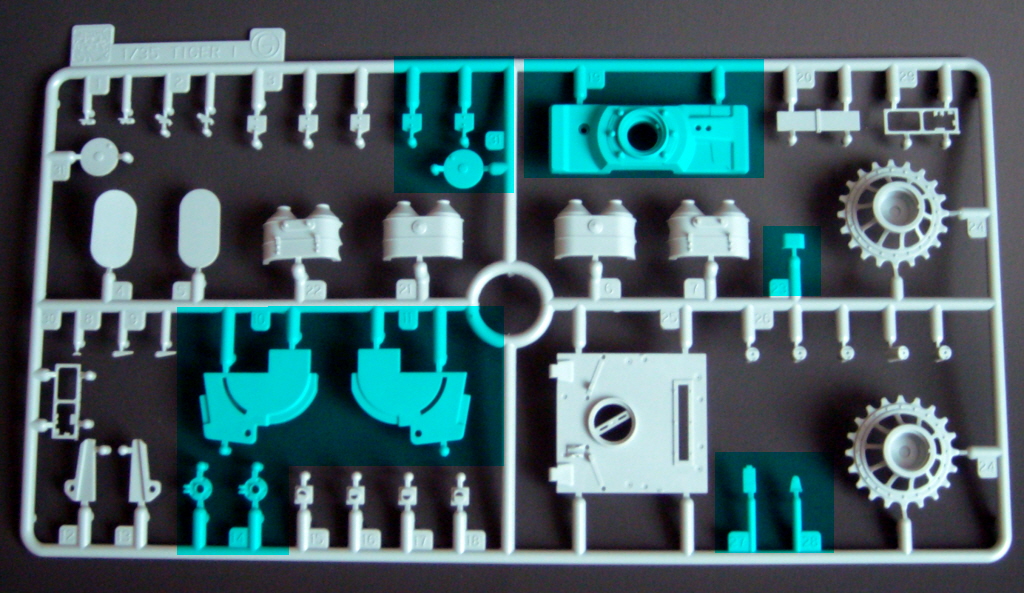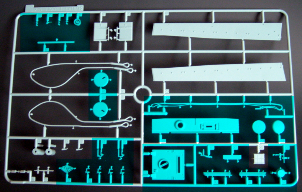 The particular characteristics of the turret VK 45.01 (Rh) are present in the kit, such as the side embrasures, the exhaust outlet on the right side, communications port on the left and a machine gun mounted on a spherical support at the rear. The chassis part of new mold and the suspension is now much easier to assemble, since the set of wheels, decreases, of 48 parts, as in previous kits of Tiger I, to only 16, facilitating the alignment and decreasing the time of armed. Early "Feifel" type air filters are included.