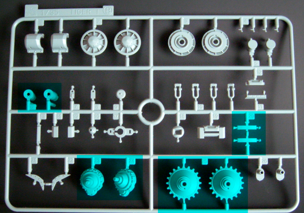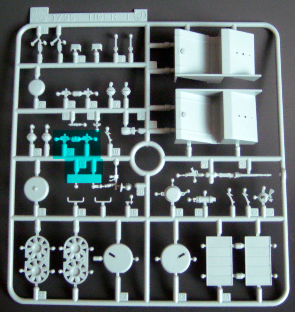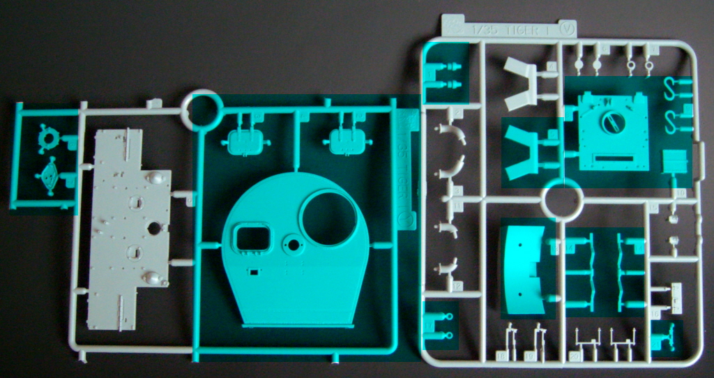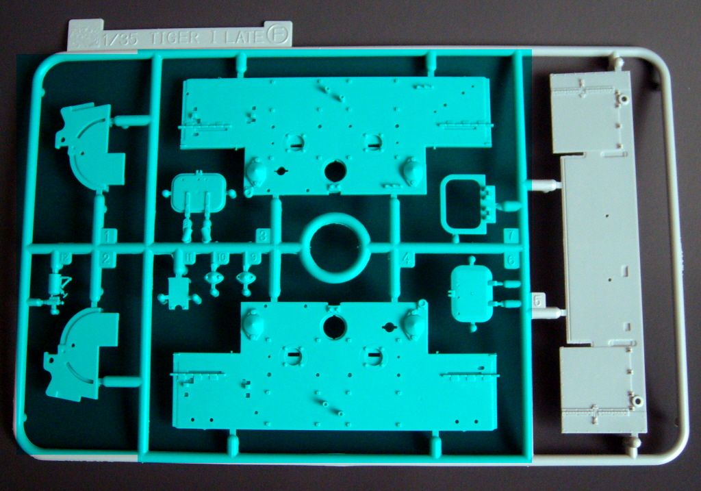 The particular characteristics of the turret VK 45.01 (Rh) are present in the kit, such as the side embrasures, the exhaust outlet on the right side, communications port on the left and a machine gun mounted on a spherical support at the rear. The chassis part of new mold and the suspension is now much easier to assemble, since the set of wheels, decreases, of 48 parts, as in previous kits of Tiger I, to only 16, facilitating the alignment and decreasing the time of armed. Early "Feifel" type air filters are included.