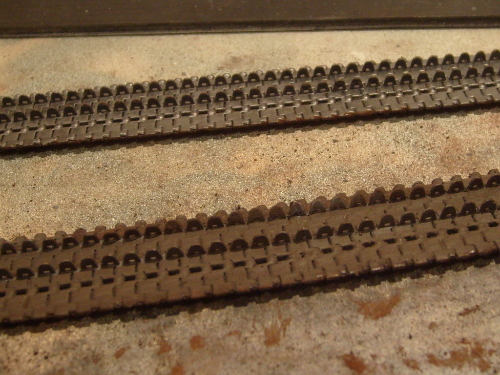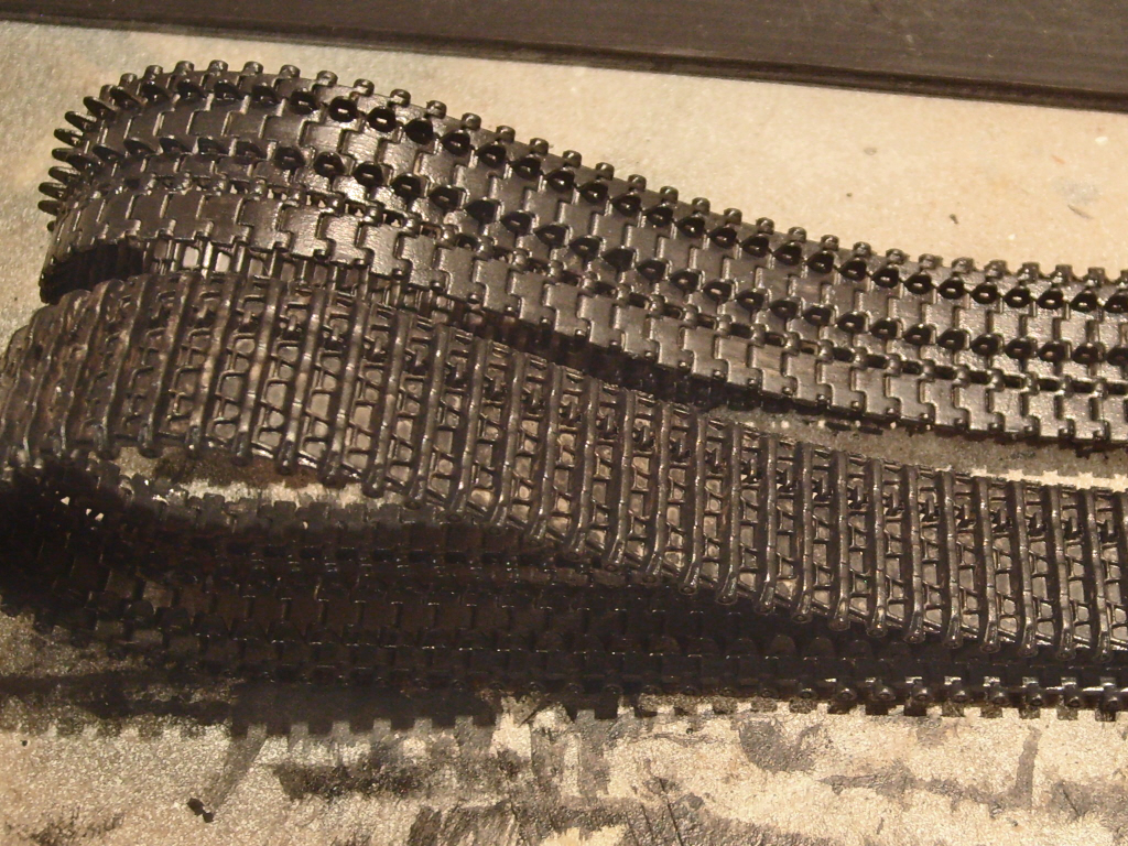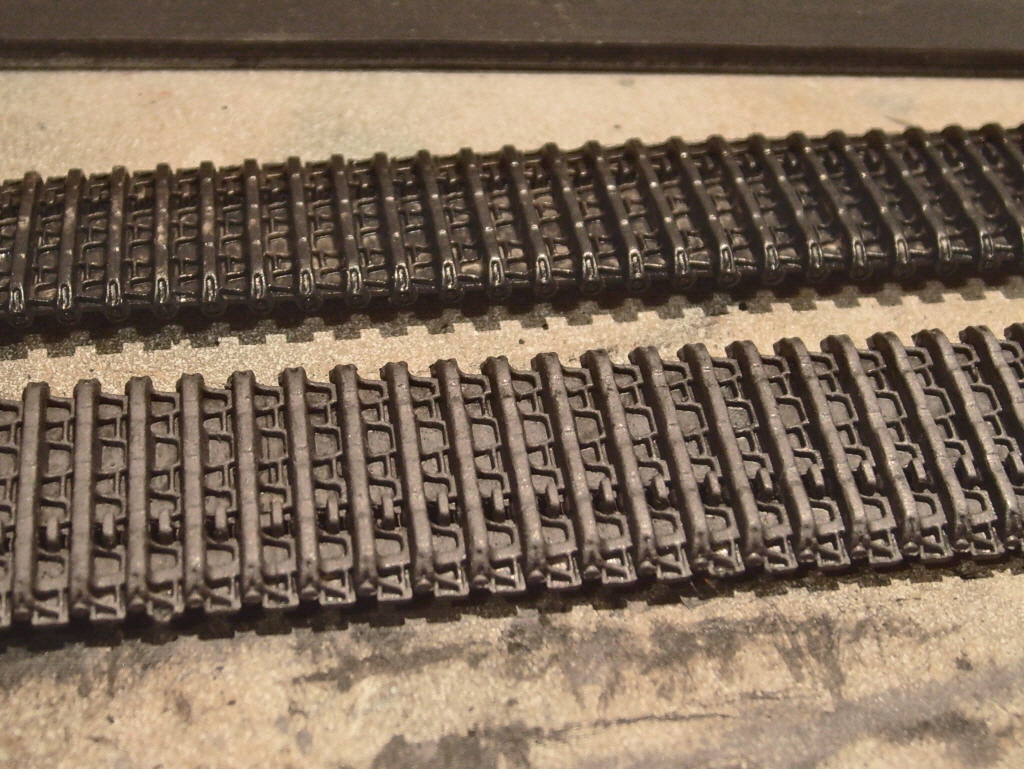 Treating the tracks: 1).- I mixed Tamiya X-18, Semi-gloss black, 40% + XF-24 Dark-grey, 60%. 2).- Here I applied Humbrol #27003, Metal Cote (Polished steel), you can see the difference in the colors.